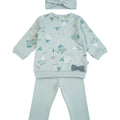 Conjunto Baby Bol 3 piezas: sueter estampado de ovejas, jogger y accesorio para el cabello color verde para niña