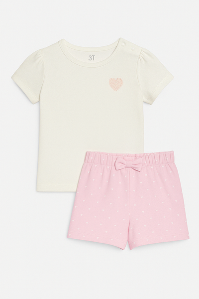 Conjunto Kinder 2 piezas: body manga corta, y Short con diseño corazones de algodón color rosa para Niña